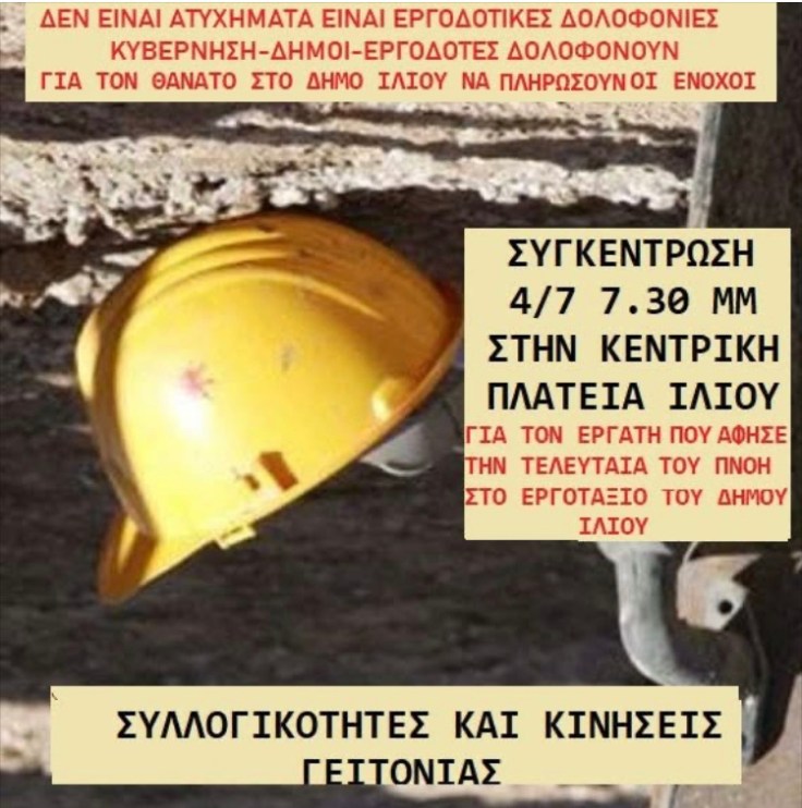 Να καταστήσουμε σαφές ότι ο εργαζόμενος δεν «έφυγε » από τη ζωή όπως αναφέρει η αισχρή αιτιολόγηση αναβολής αλλά τον δολοφόνησαν όλοι αυτοί που έδωσαν την εντολή και συναίνεσαν σε αυτήν προκειμένου να εργαστεί ο 65 χρόνος εργαζόμενος του Δ. Ιλίου απασχολούμενος στο πρόγραμμα της ΔΥΠΑ 55-67 για έκτη συνεχόμενη ημέρα και μάλιστα υπό συνθήκες καύσωνα.