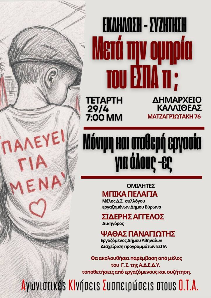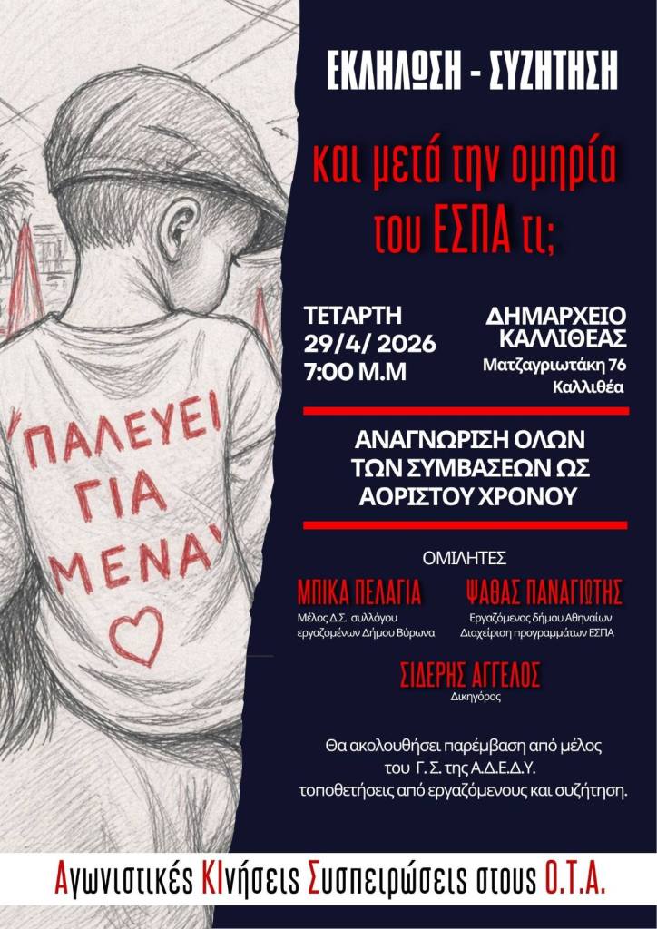 Στον απόηχο των τελευταίων δυναμικών κινητοποιήσεων σας προσκαλούμε στην εκδήλωση – συζήτηση σχετικά με το μέλλον μας ως συμβασιούχοι την Τέταρτη 29.04.2026 στις 19.00 στο Δημαρχείο Καλλιθέας για ενημέρωση και συζήτηση με τους εκλεκτούς ομιλητές του πάνελ μας.