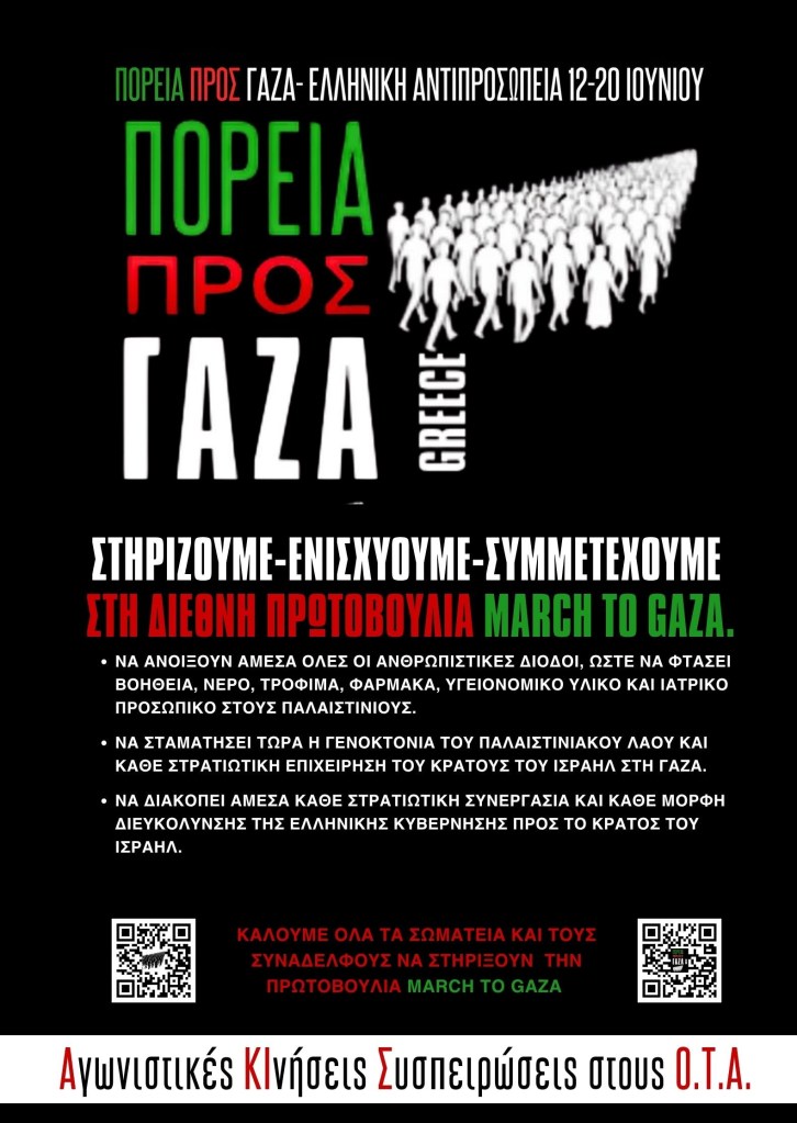 Οι Αγωνιστικές Κινήσεις Συσπειρώσεις στους ΟΤΑ ενώνουμε τη φωνή μας με τα εκατομμύρια των ανθρώπων σε όλο τον κόσμο που αγωνίζονται για να σταματήσει η γενοκτονία του παλαιστινιακού λαού. Στηρίζουμε – ενισχύουμε και συμμετέχουμε στη διεθνή πρωτοβουλία March to Gaza, μια παγκόσμια κινητοποίηση που επιχειρεί να σπάσει τον ασφυκτικό αποκλεισμό και να φτάσει βοήθεια και αλληλεγγύη στον σκληρά δοκιμαζόμενο λαό της Γάζας.